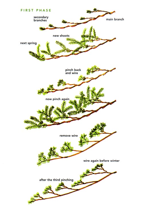 The ramification process includes pinching, pruning and tapering. When done correctly, the bonsai’s design will look much cleaner and it will look like a miniature tree. A bonsai with lots of ramification will be easier to shape and the natural taper gives the bonsai a more natural appearance.