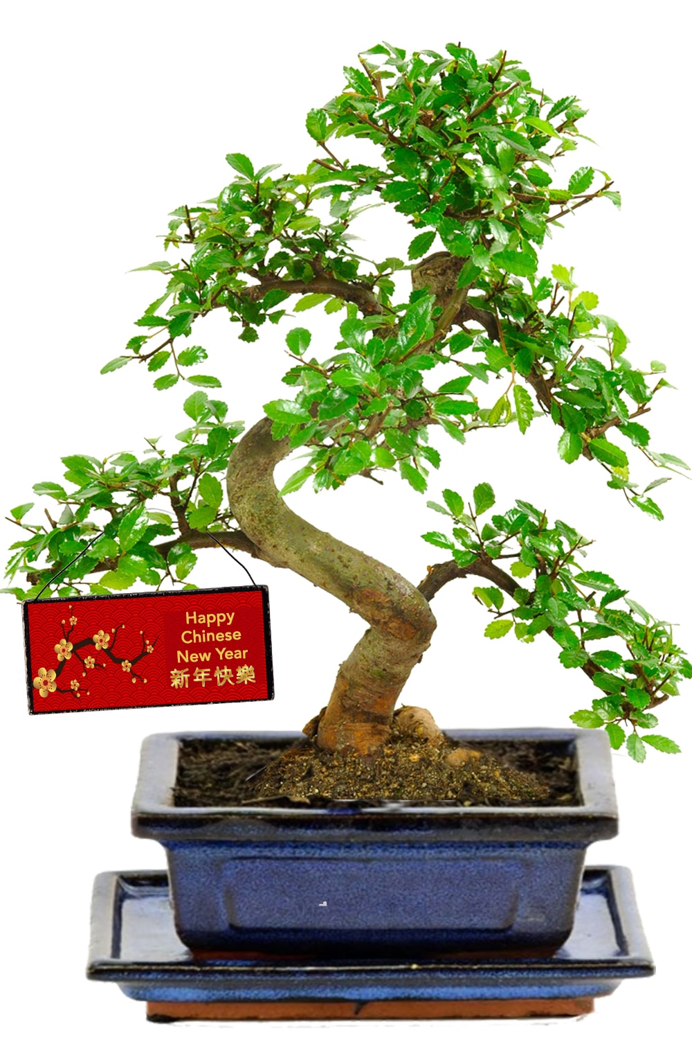 Chinese New Year Tree | The perfect beginners indoor bonsai tree with lovely ‘Happy Chinese New Year’ tag and drip tray. Twiggy and twisty 8 year old indoor Chinese Elm with naturally small leaves which symbolises inner strength, intuition, wisdom and love.