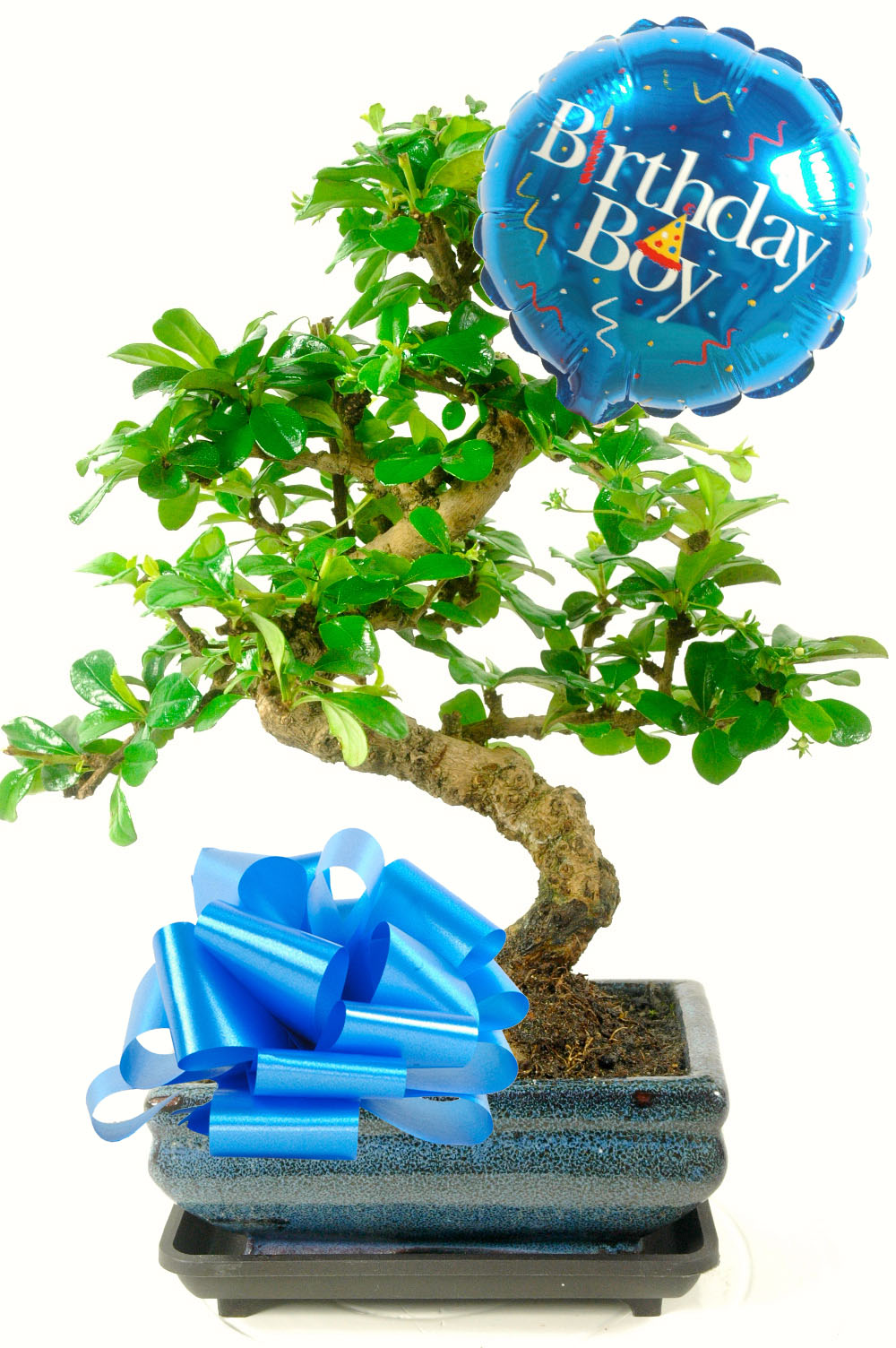 Bonsai make fantastic gifts for everyone. Not only are they lovely to look at, they bring a sense of calm to your environment. They are wonderful hobby makers! The Fukien Tea Tree is a very popular beginners variety which display twisty trunks with creamy textured bark and rich glossy leaves. During summer, this variety grows delicate white flowers! This 8 year old bonsai comes potted in a navy blue ceramic pot. Additionally, it is supplied with a dark coloured drip tray which catches water and protects surfaces. To finish the gift, we have added a blue “Birthday Boy” balloon.