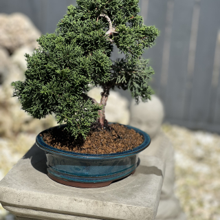 Presenting a stunning and intricate evergreen Chinese Juniper bonsai, gracefully potted in a soft blue ceramic pot. This captivating bonsai embodies beauty and artistry, capturing the essence of nature’s elegance in a small but remarkable form.