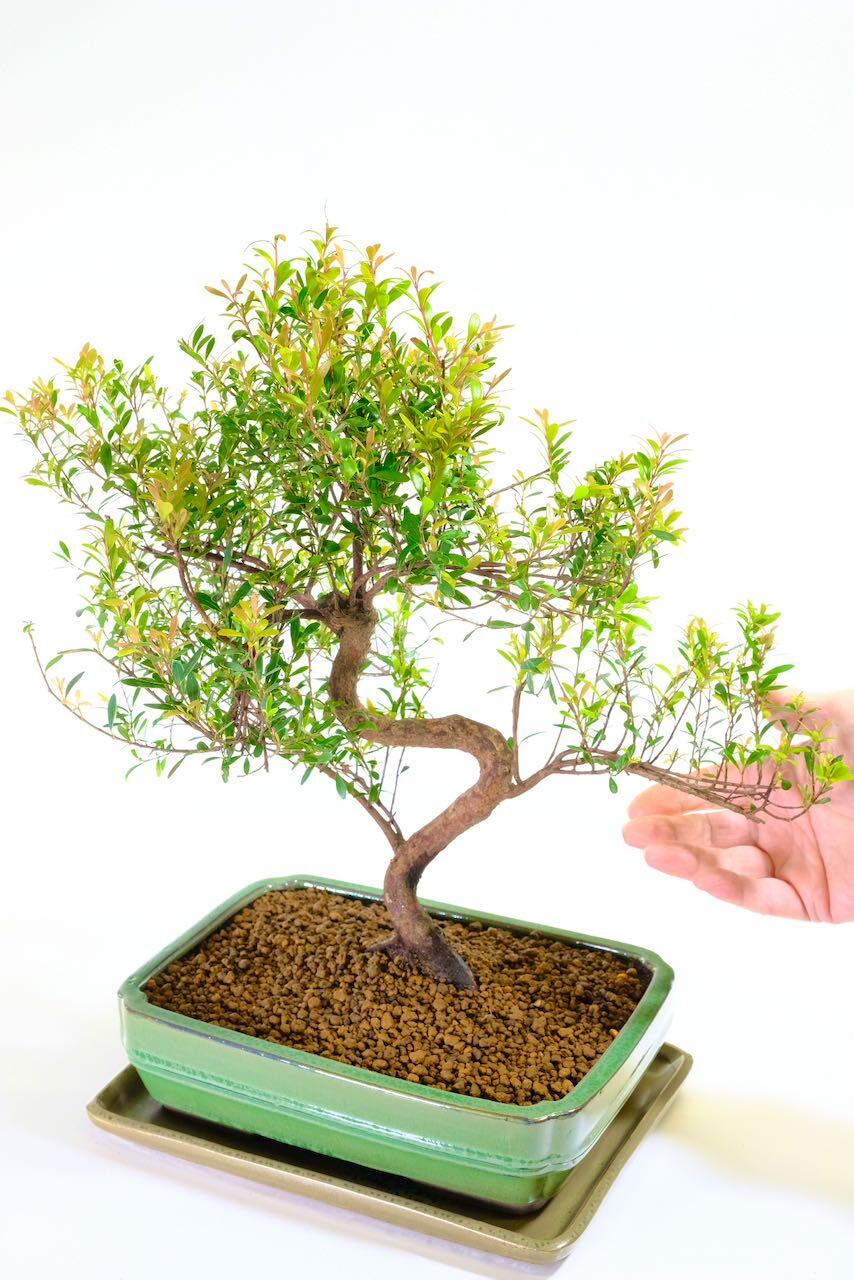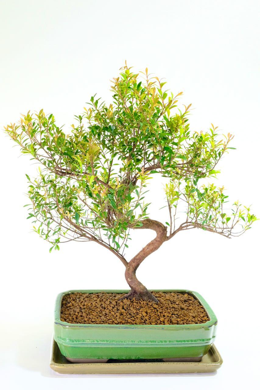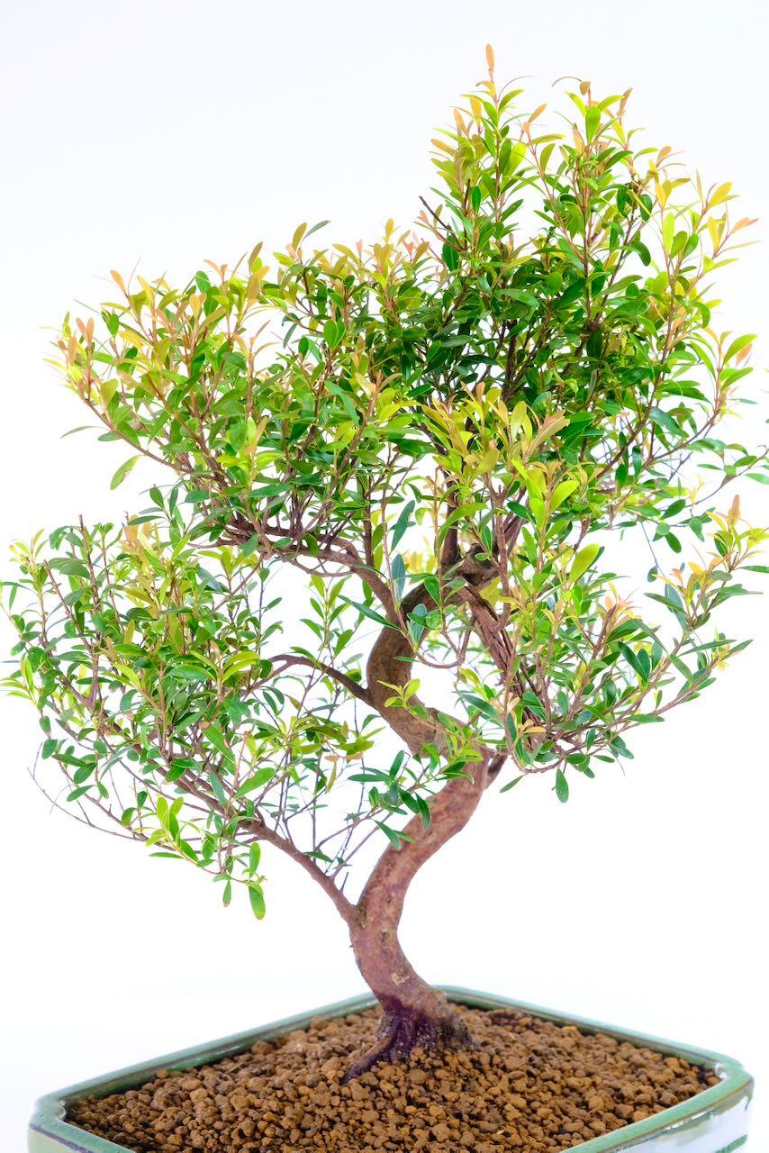 As the seasons warm, this species produces soft cream, pom-pom-like flowers that attract bees and add a delicate charm. After flowering, the tree often forms small cherry-like fruits that turn pinkish-red as they ripen. They look joyful against the glossy green leaves and give the bonsai a wonderfully seasonal rhythm. Traditionally, Roseapple bonsai are considered Trees of Good Fortune, representing luck, prosperity and positivity — making this one a meaningful gift or centrepiece.