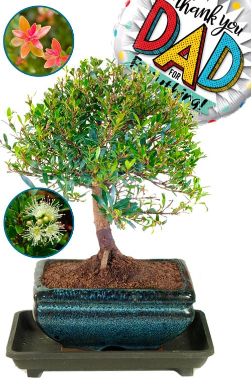 Make this Father’s Day unforgettable with the incredible Myrtle, a captivating Syzygium buxifolium, also known as Roseapple, indoor bonsai. This fruiting and flowering bonsai showcases an enchanting orchard-style design, accentuated by its beautiful features and red-toned bark. Add a touch of sentiment with the “Thank you Dad for everything” Father’s Day Balloon, making it an extraordinary gift.