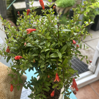 As late spring turns to early summer, expect a dazzling display of bright orange-red, trumpet-shaped flowers with a crinkled, waxy texture—each one rich in nectar and irresistible to bees. Over time, these blooms give way to charming miniature pomegranates that ripen from soft green to golden red. While edible, these tiny fruits are mostly admired for their ornamental appeal and as a delightful talking point.