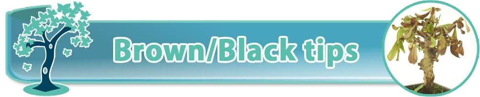 In the case of indoor bonsai, brown/black tips to the leaves is usually indicative of over-watering. Frequently this is also associated with the bonsai becoming loser or wobbly within the pot. Over-watering is not something which happens quickly; it is a slow degenerative issue which slowly rots the roots and the bonsai can even exhibit symptoms of wilty leaves (usually associated with lack of water). This is because the roots become weak and do not function properly.