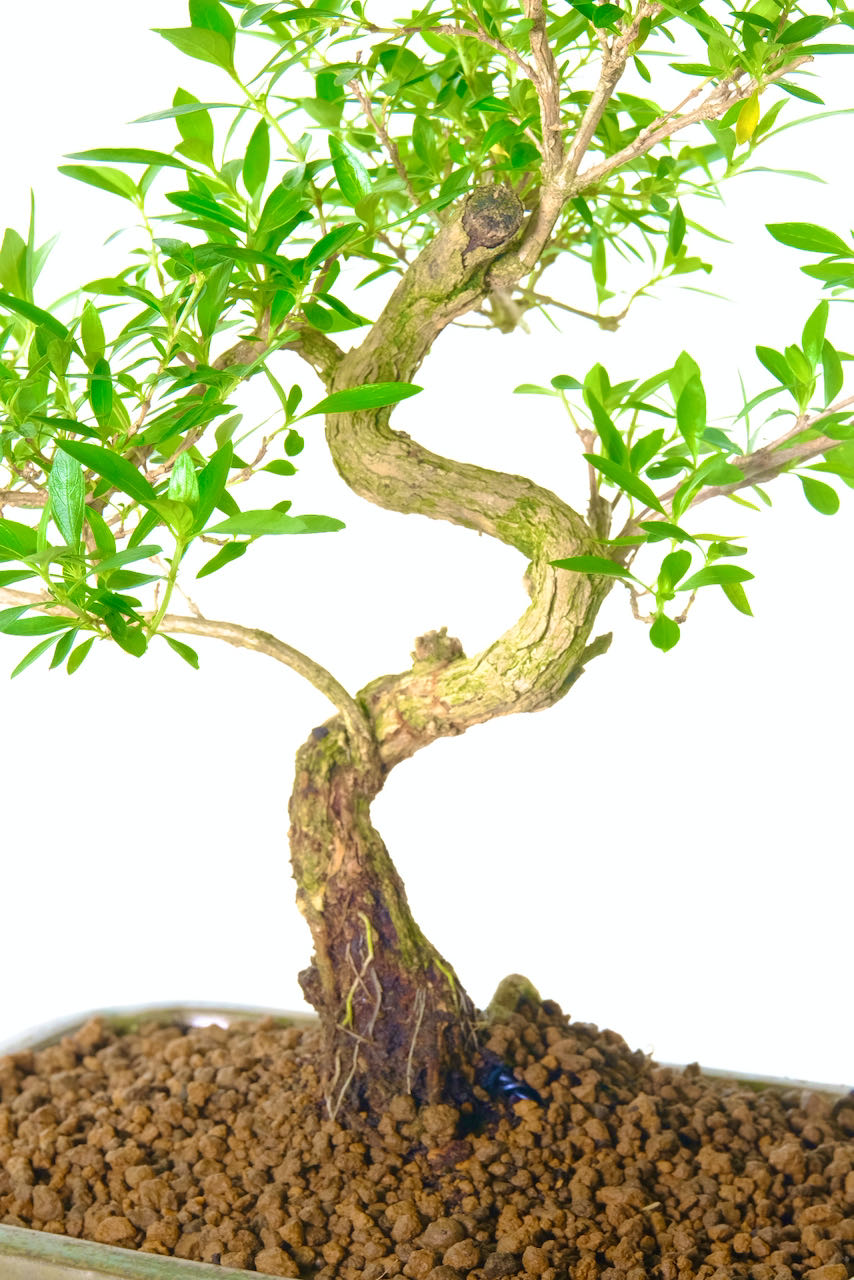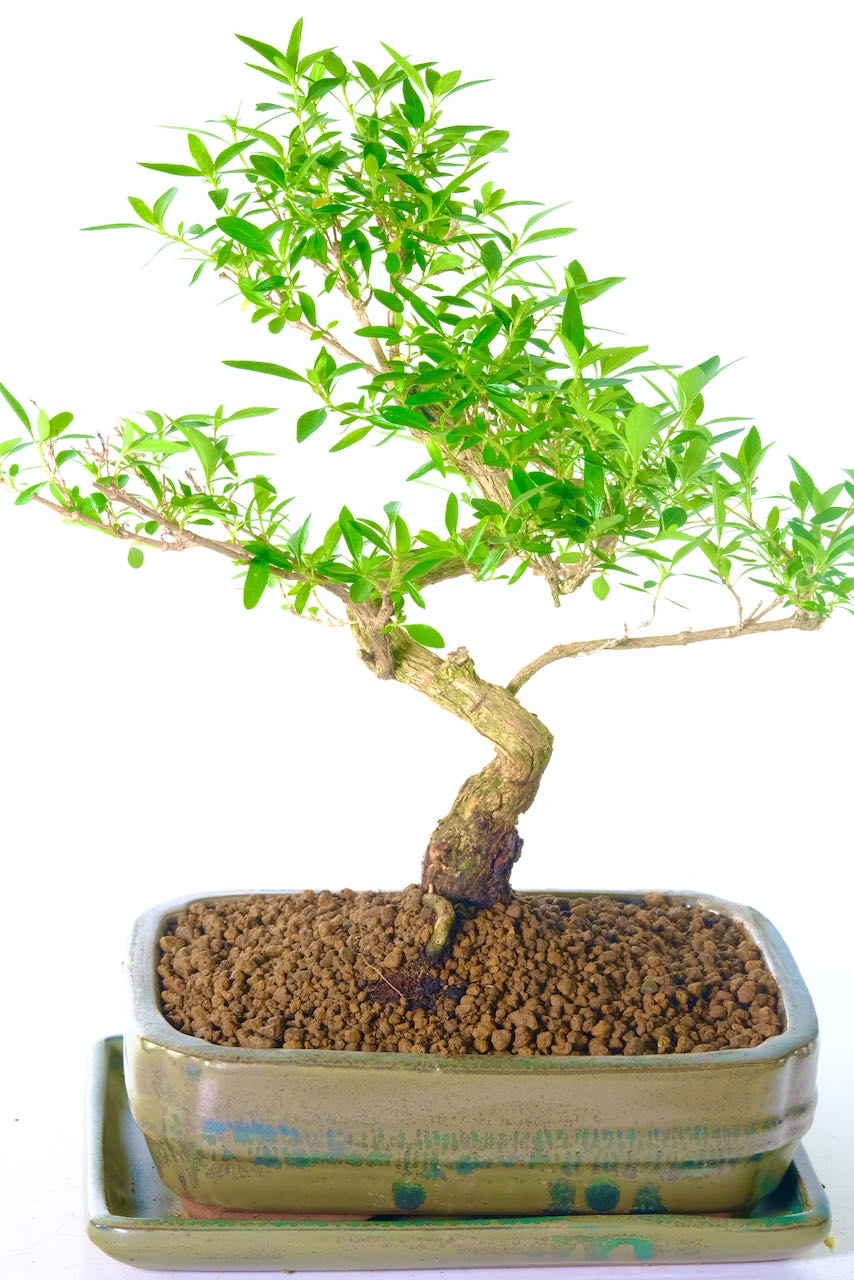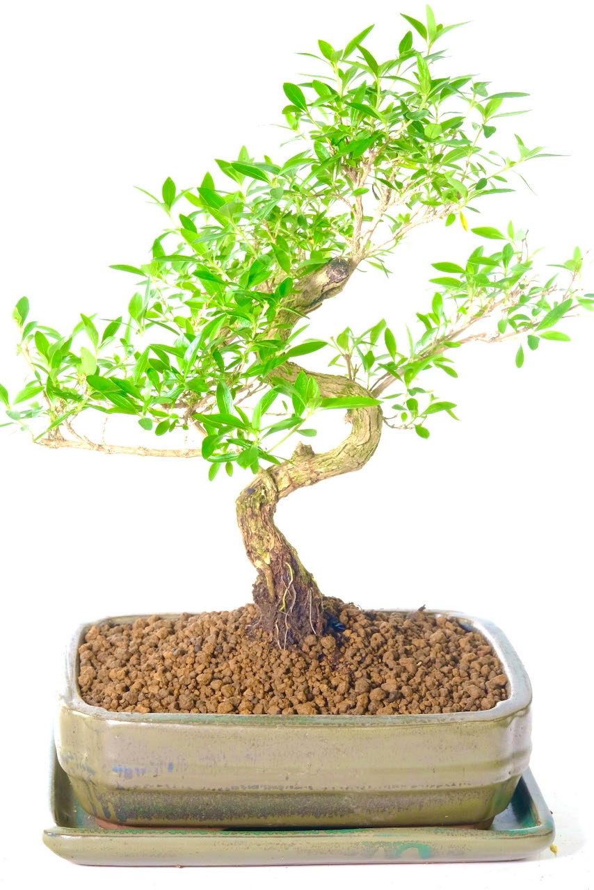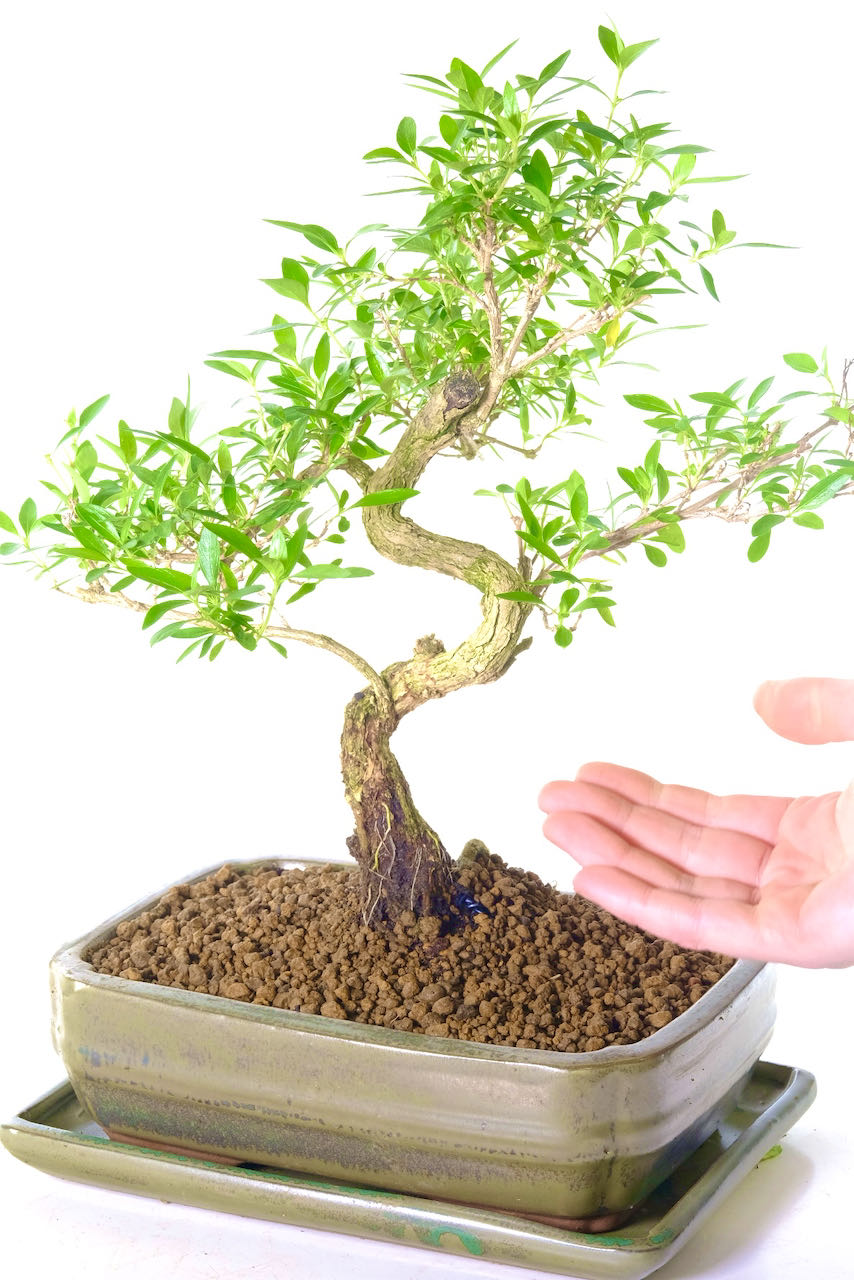 To further enhance its appeal, this exceptional Serissa bonsai comes in a pretty silvery green ceramic pot with a matching tray. The pot’s modern design complements the bonsai’s elegant form and adds a touch of sophistication to any room. The fluted corners of the pot finish the presentation beautifully..