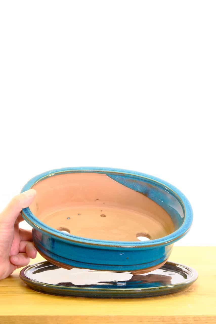 27cm Oval Glazed Cyan Ceramic Bonsai Pot with Matching Tray