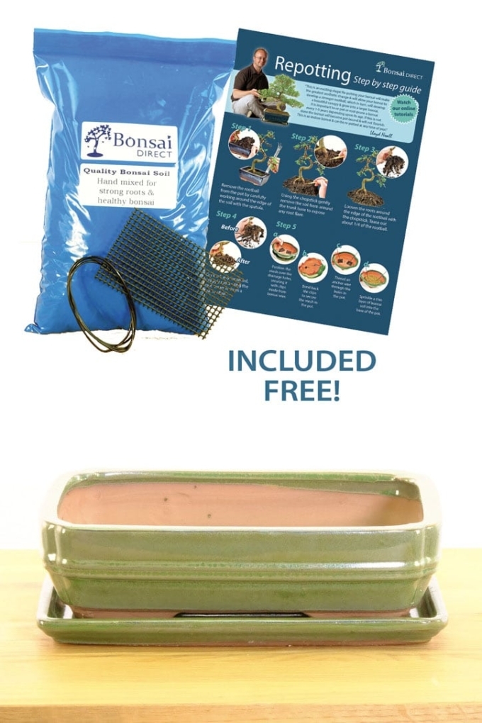 27cm Rectangular Glazed Olive Green Ceramic Bonsai Pot with Matching Tray