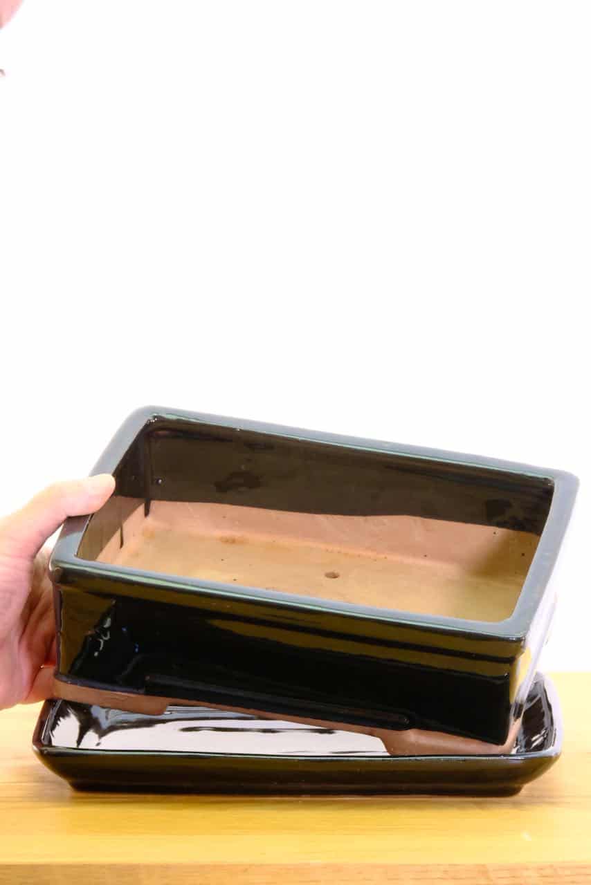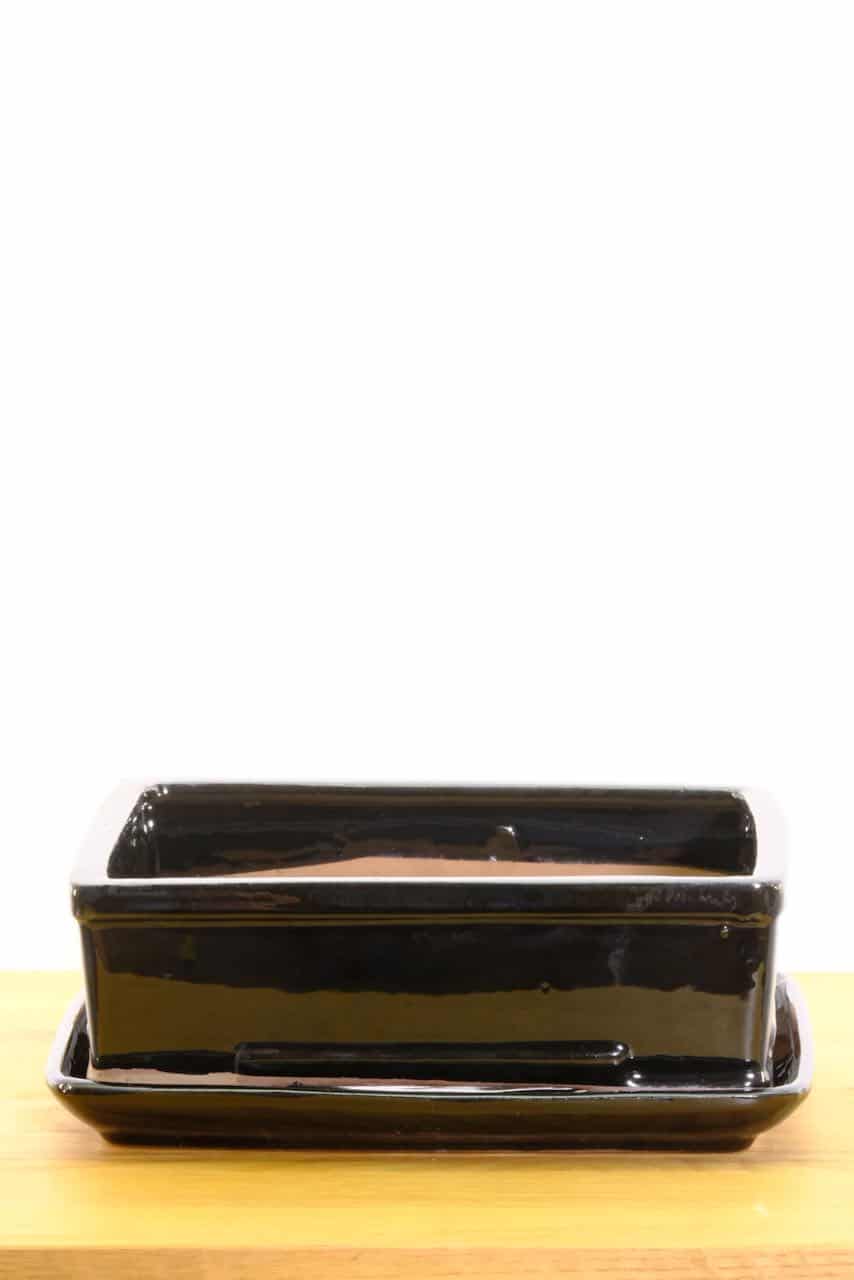 33cm XL Rectangular Glazed Black Ceramic Bonsai Pot with Matching Tray