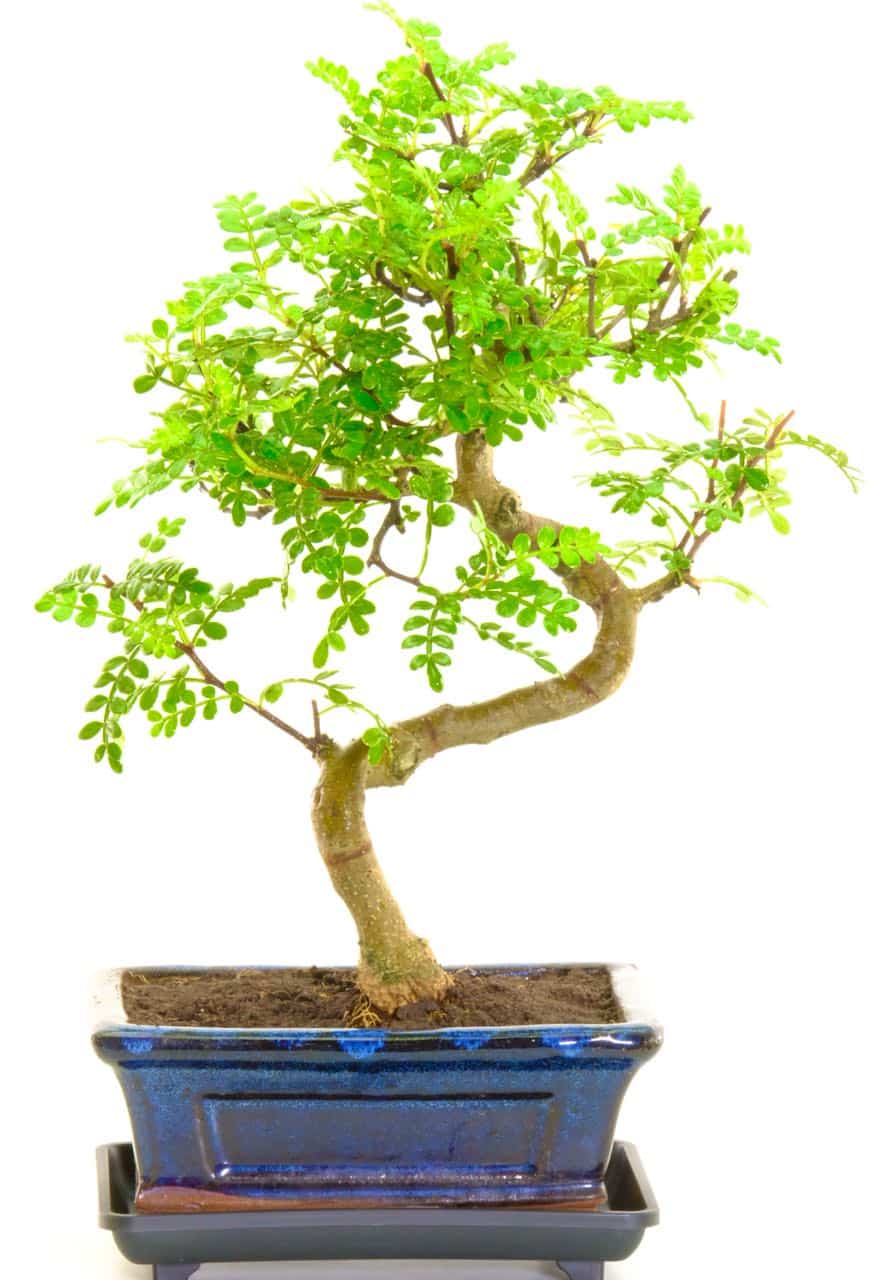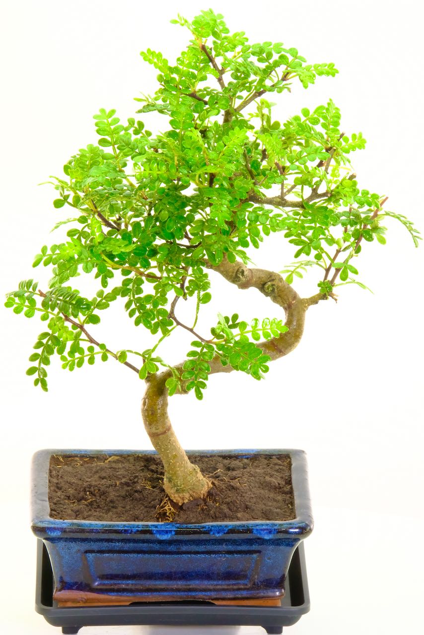 A carefully grown 8-year-old Pepper Tree bonsai with a distinctive twisting trunk