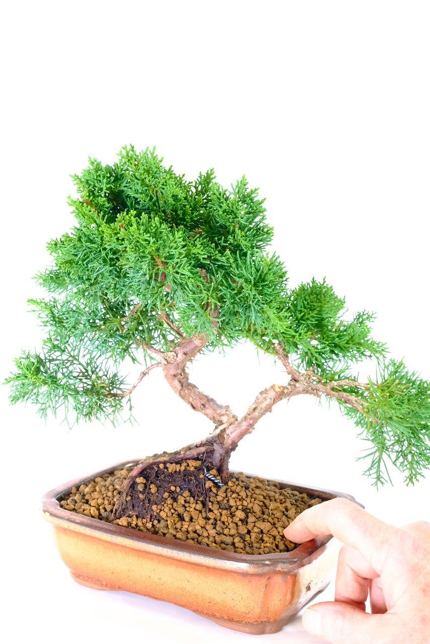 To complete the design, Lloyd has potted this remarkable juniper into a brand-new sparkly bronze glazed ceramic pot. The warm metallic tones highlight the reddish-brown bark beautifully, while also complementing the deep green mature foliage. The tree feels balanced, artistic and full of life. It has been planted in top-quality Akadama, which provides excellent drainage and encourages strong, healthy root growth.