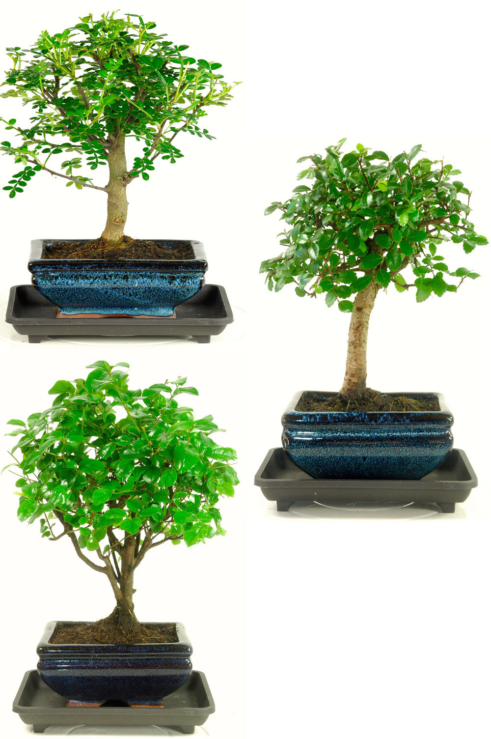 Bring a touch of the forest indoors with this great-value 3 pack indoor bonsai set. A superb triple pack of baby bonsai trees. Each tree comes potted in a stylish blue ceramic pot with a plastic drip tray that catches excess water. This set offers a fun and affordable way to start your own mini indoor woodland and enjoy the unique beauty of three classic bonsai species.