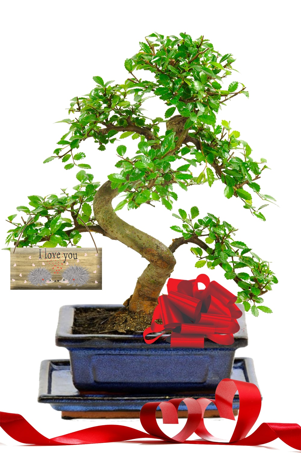 The bonsai arrives potted in a navy blue ceramic pot that works beautifully in both modern and traditional interiors. To finish the gift with warmth and charm, an “I Love You” wooden hanging tag featuring a cute hedgehog design is included. This small detail makes the gift feel genuinely personal.