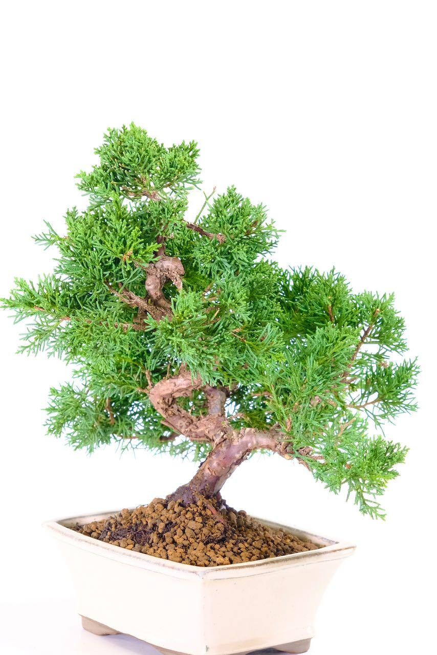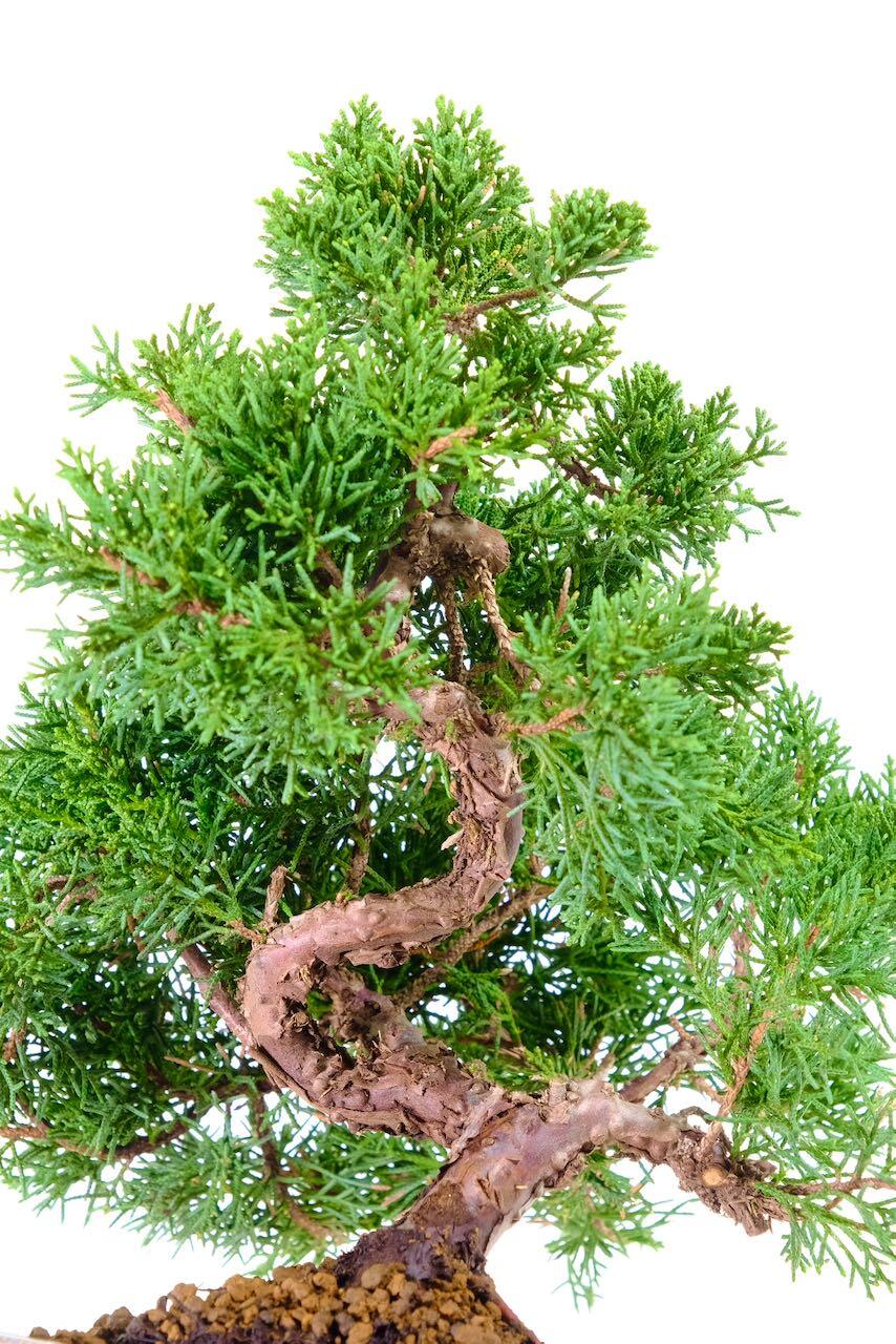 This species has a naturally elegant look. Its sweeping branches, fine-textured scale foliage, and beautifully textured reddish-brown bark give it a refined, artistic presence. As the tree ages, the bark exfoliates to reveal lighter tones beneath, enhancing its rugged, mature charm and creating the sense of an ancient tree in miniature.