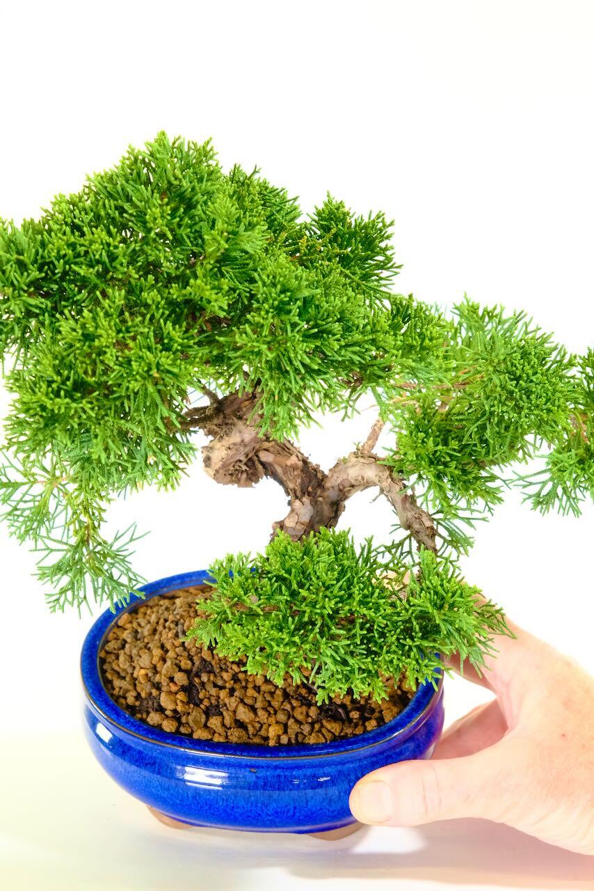 The contrast between the tree’s rugged bark and the smooth deep blue pot gives this bonsai real visual depth. It feels as elegant as it is strong.