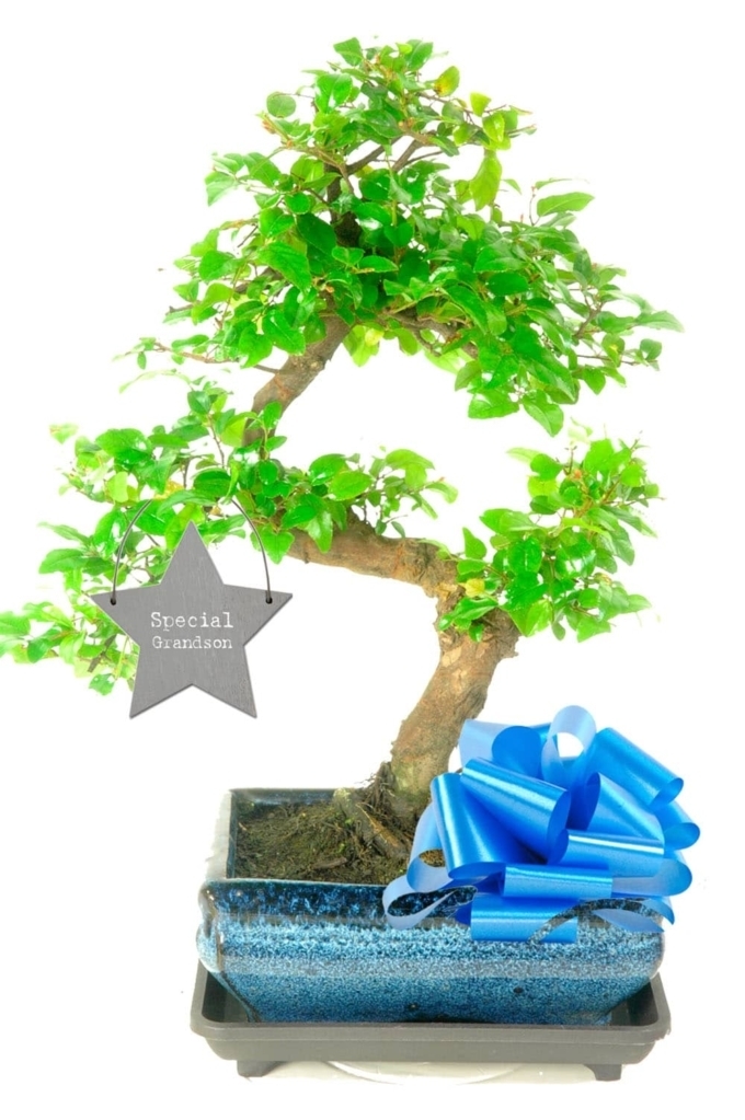 This gorgeous indoor Chinese Sweet Plum Bonsai tree makes a delightful and unique starter bonsai. With a drip tray, and lovely star-shaped tag saying special grandson.