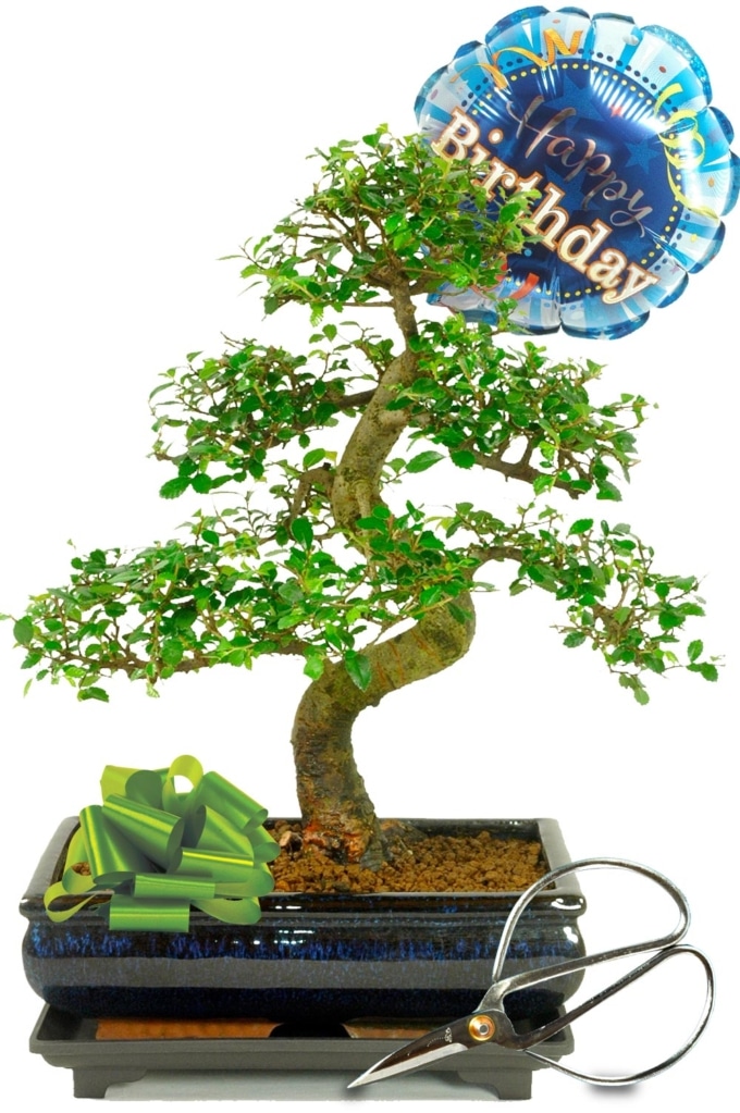 The bonsai is potted in an elegant blue ceramic bonsai pot that enhances the rich green foliage and refined structure. A practical drip tray is included to protect surfaces, while bonsai pruning scissors allow gentle shaping as the tree grows. In addition, a cheerful blue Happy Birthday foil balloon completes the presentation, ensuring the gift feels celebratory straight out of the box.