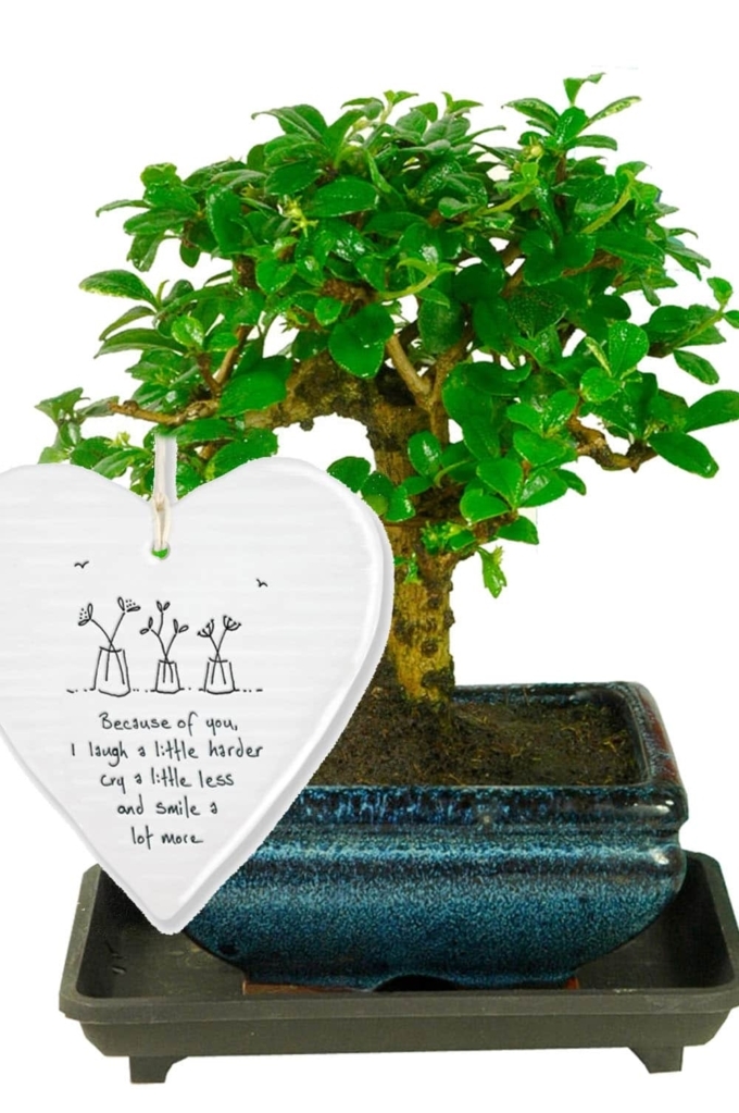 The Oriental Tea tree is a stunning, artistic bonsai with beautiful white flowers which symbolises love & devotion, making it a wonderful gift for all occasions.’. Potted into a blue ceramic bonsai pots with drip tray.