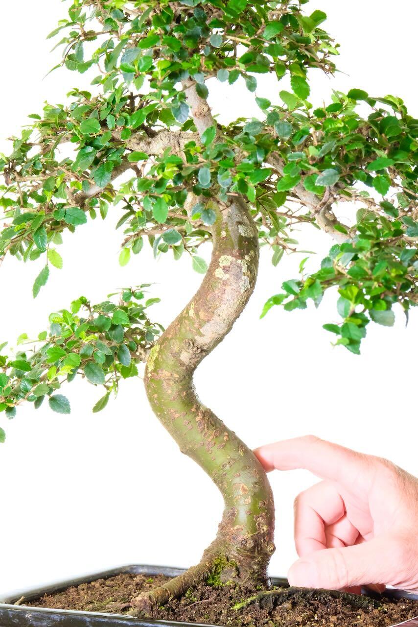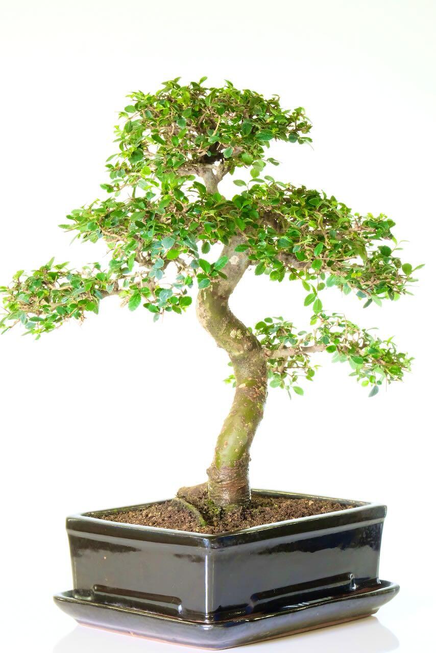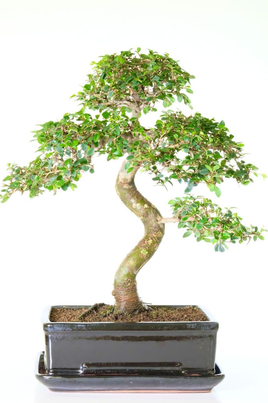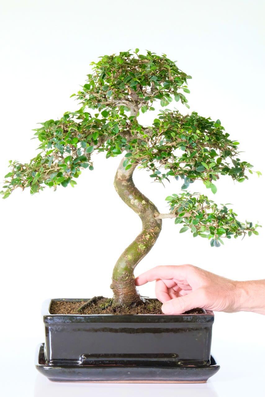A large and impressive Chinese Elm Indoor Bonsai with Lovely S-Shaped Trunk. Easy to Care For, Perfect for Beginners. This bonsai has the most beautiful and majestic stately appearance – it is a large bonsai & is extremely impressive and artistic with a commanding and powerful trunk.
