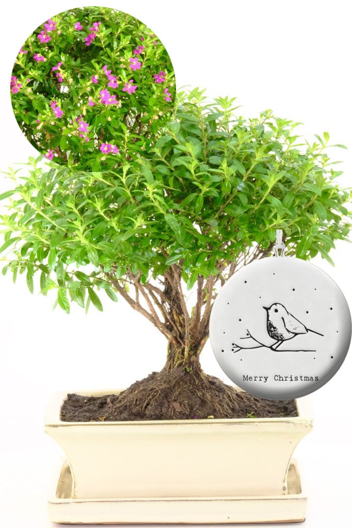 Your Cuphea bonsai arrives in a stylish cream ceramic pot with a matching drip tray. A flat porcelain “Merry Christmas” bauble hangs from the branches, featuring a robin motif and festive fir sprigs. This keepsake decoration adds instant seasonal charm.