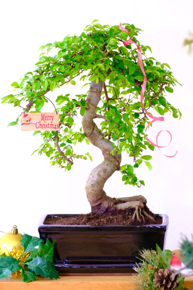 This 16-year-old Ulmus parvifolia bonsai features powerful exposed roots, a strong winding trunk and a refined, balanced canopy. A wooden Merry Christmas tag with robin design is included with this stylish beginners indoor bonsai tree.