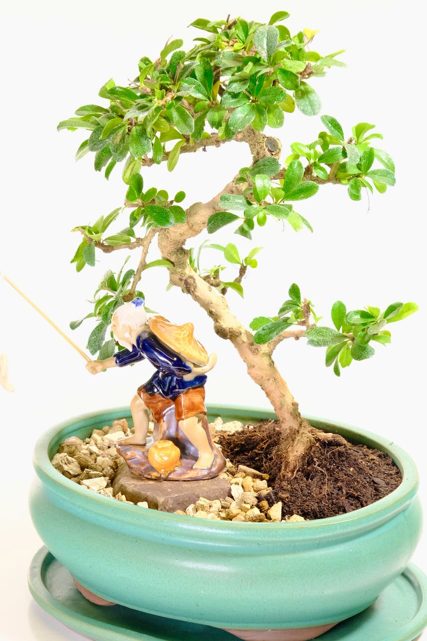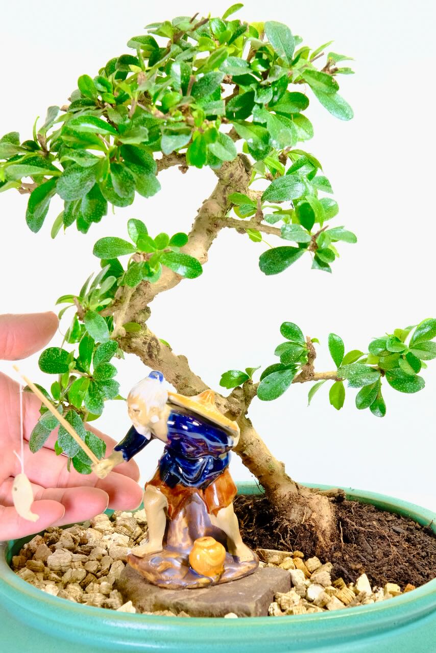 The Fukien Tea originates from Southeast Asia and thrives in warm, bright indoor rooms. It stays compact and develops fine branching, which makes it ideal for beginners. Furthermore, it produces delicate white blooms during the warmer months. These flowers last only a short time, yet they appear repeatedly. The species responds well to gentle pruning and suits anyone wanting a forgiving but elegant bonsai. Symbolically, it represents calmness, devotion and thoughtful contemplation, making it perfect for this riverside fisherman scene.