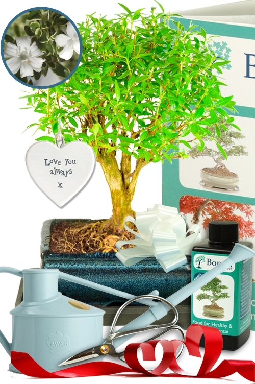 This Tree of a Thousand Stars indoor bonsai kit features a flowering Serissa foetida with dramatic exposed roots and gnarly character. Delicate white star-shaped blooms add seasonal beauty and charm. The kit includes pruning scissors, bonsai feed, a dark drip tray, a watering can (in the colour you choose), and a detailed care handbook. A porcelain heart engraved “Love you always” adds a romantic keepsake. Beginner-friendly and full of symbolism. A meaningful romantic gift representing love, hope, and well-being.