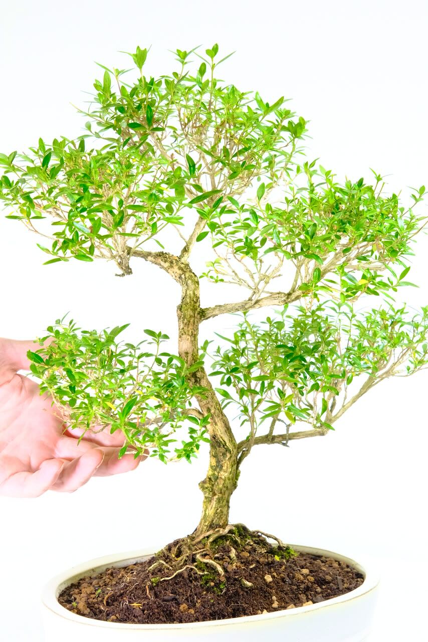 This spectacular 21-year-old Serissa foetida grows with elegance and maturity after many years of slow, careful pot cultivation. It stands 46cm tall and forms a graceful silhouette that immediately commands attention. You will receive this exact individually photographed bonsai, presented in an ivory oval ceramic pot with a decorative band that highlights its refined design. The soft ivory glaze enhances the tree’s delicacy and supports its artistic styling.