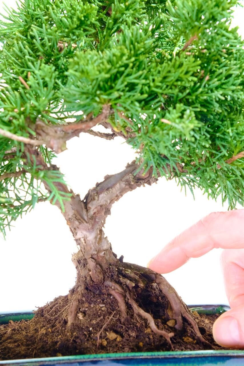 It also features an impressive nebari, with surface roots that grip and almost claw into the soil, visually anchoring the tree and creating a strong, natural connection between the trunk and the pot.