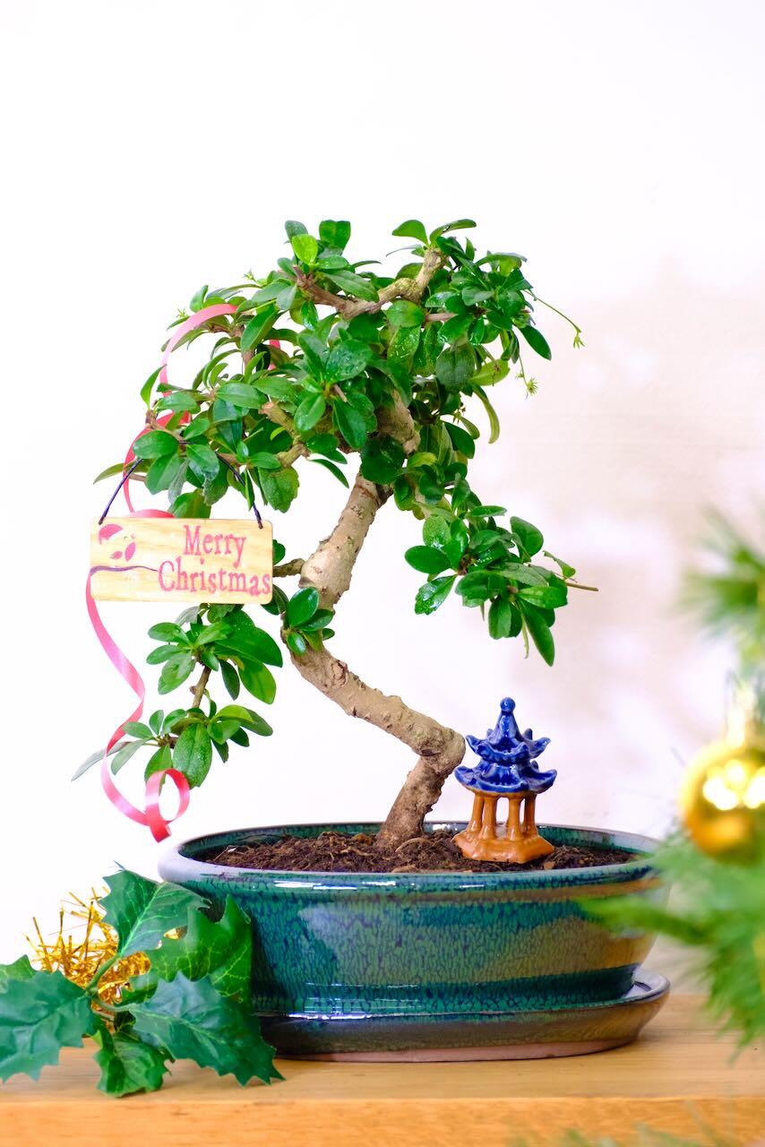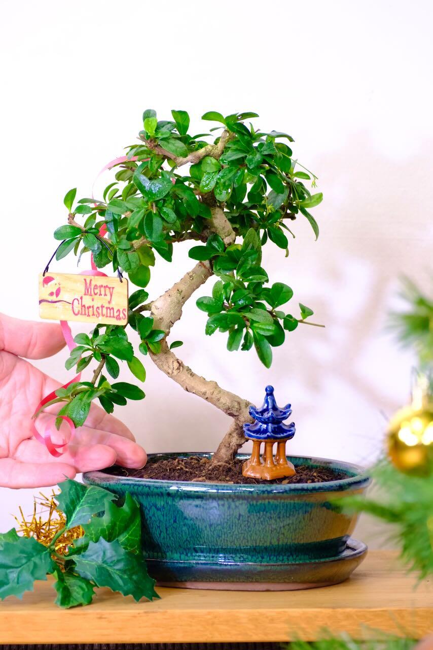 This delightful 8-year-old Carmona is full of character, festive charm and artistic movement. With its graceful structure, miniature temple and serene forest green pot, it makes a beautiful Christmas gift — or a meaningful seasonal treat for your home.
