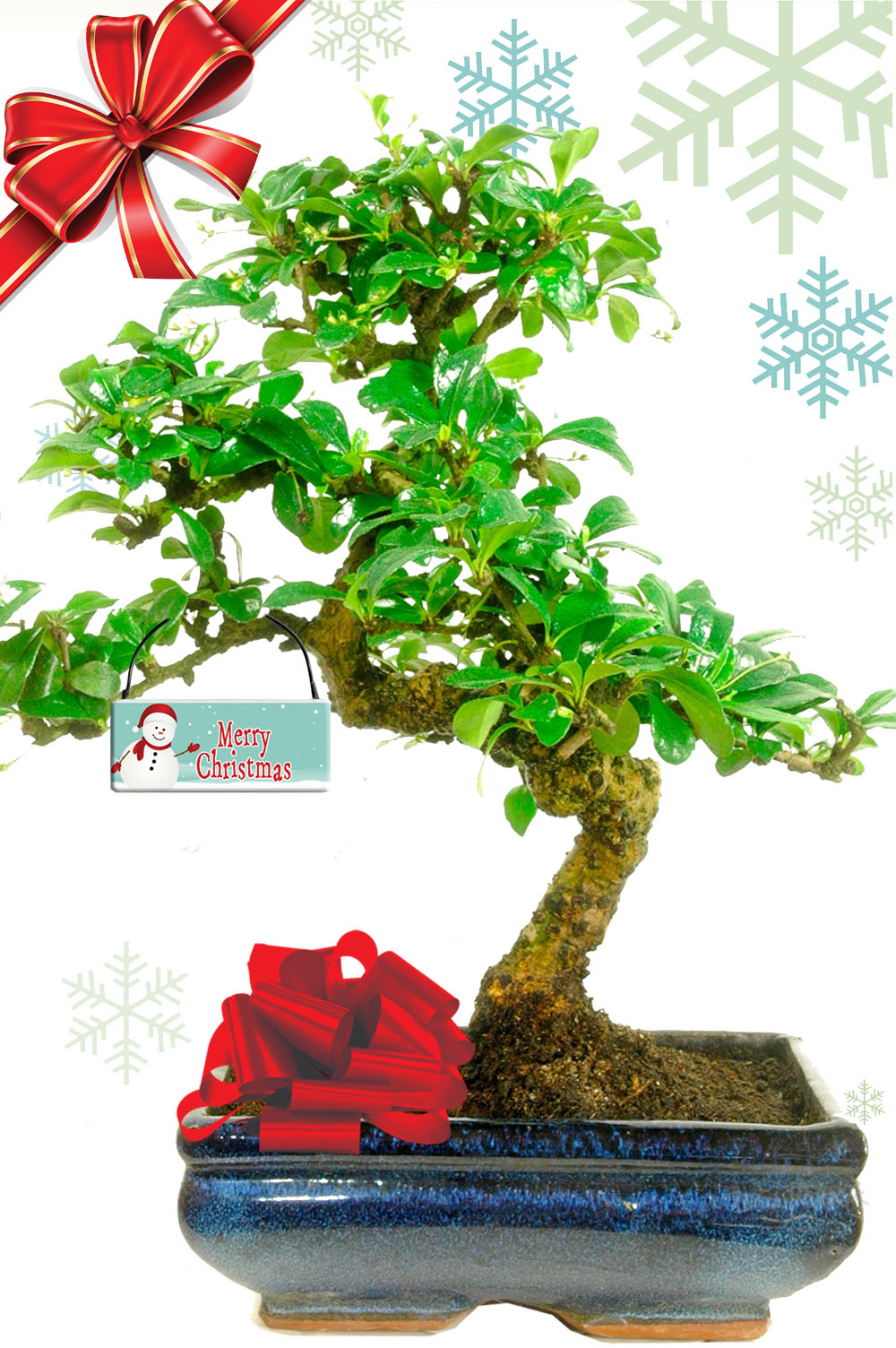 The elegant 12-year-old Carmona microphylla (Fukien Tea Tree) bonsai trees make a truly unique Christmas gifts. With its mature trunk, expressive curves, and refined indoor styling, it creates a captivating natural display for any home. Potted in a classic blue ceramic pot and paired with a dark-coloured drip tray, this mid-sized bonsai blends artistry and simplicity. A charming “Merry Christmas” wooden tag adds a seasonal flourish to the presentation.