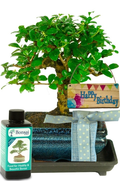 Complete with bonsai feed, a drip tray, and a FREE bonsai care leaflet, this kit is designed to delight beginners. The included Oriental Tea Tree is both simple and elegant, boasting lovely white flowers in the summer months The flowers are beautifully highlighted by its waxy foliage. The decorative ‘Happy Birthday’ tag, along with the charming blue hessian/blue spotty ribbons, adds an extra layer of charm to this heartfelt birthday gesture.