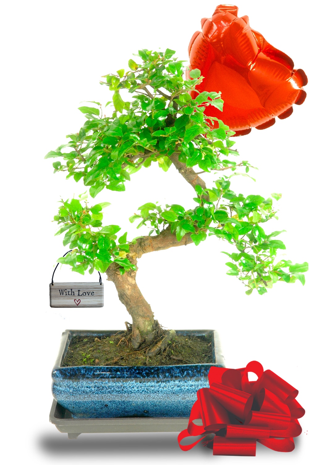 This Valentine’s Day bonsai arrives potted in a classic blue ceramic bonsai pot and paired with a dark-coloured drip tray to keep surfaces tidy. To enhance the romantic presentation, we include a red heart foil balloon and a wooden “With Love” hanging tag. An expert printed care guide completes the set, offering clear guidance along with species information and symbolism.